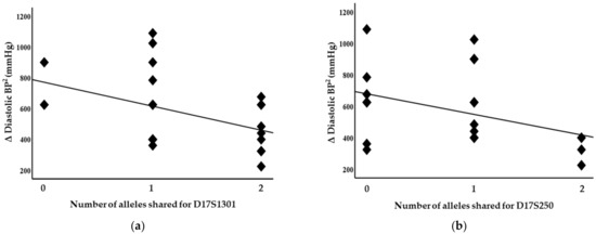 Diastolic blood pressure associated with chromosome 17 markers in siblings sharing alleles at IBD, suggesting evidence of linkages with (a) D17S1301 (p = 0.04) and (b) D17S250 (p = 0.05).