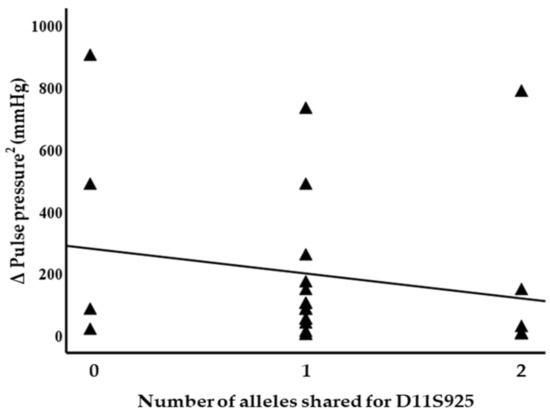 Blood pressure levels correlated with chromosome 17 and 11 microsatellite markers, suggesting evidence of linkage. Significant inverse correlations were identified between the squared difference in the systolic blood pressure and the number of alleles shared between the siblings for the D17S799 (r = −0.51, p = 0.011) and D17S250 (r = −0.42, p = 0.04) markers, as illustrated in Figure 1. Diastolic blood pressure also correlated with markers on chromosome 17, D17S1301 (r = −0.42, p = 0.04; Figure 2), D17S250 (r = −0.39, p = 0.05; Figure 2) and D17S928 (r = 0.42, p = 0.04, Figure 3), and the D11S1999 marker on chromosome 11 (r = −0.46, p = 0.025; Figure 3). These relationships persisted even after correcting for confounding factors including age and sex for the markers associated with systolic and diastolic pressure (Table 3). A significant inverse correlation was also observed between the DS11925 marker and the squared difference in pulse pressure (Figure 4, r = −0.44, p = 0.031), a surrogate marker of arterial compliance and an independent predictor of cardiovascular complications.