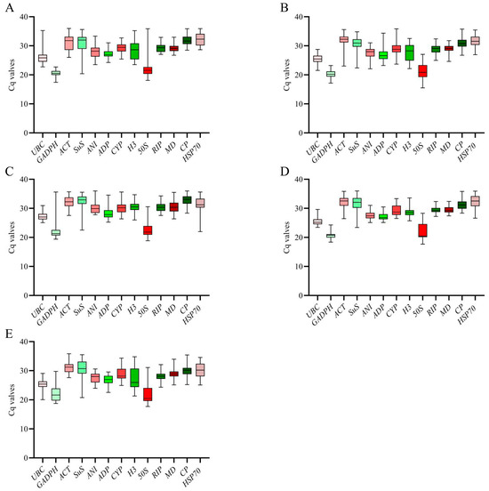 The expression levels of the thirteen candidate reference genes were assessed under abiotic stress conditions. On the y-axis, the cycle threshold (Ct) values of these thirteen candidate reference genes in all samples were plotted. A horizontal line within the box plot graph represents the median Ct value. The lower and upper bounds of the boxes represent the 25th and 75th percentiles, respectively, while the whiskers indicate the range across all samples. (A) Drought stress, (B) Salt stress, (C) Cold stress, (D) Al stress, (E) Herbicide stress.