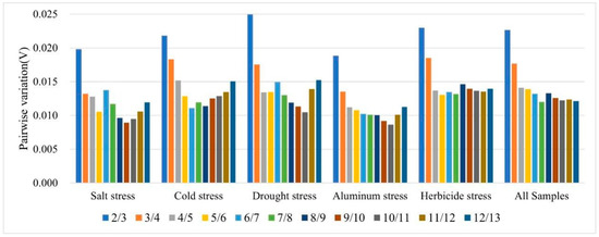 In GeNorm analysis, the consistency of gene expression is typically assessed using the M value. Generally speaking, the M value represents the degree of stability in expression levels and is negatively correlated with the expression level of the reference gene. In all abiotic stress samples, ADP and RIP were identified as the genes with the highest level of stability, while 50S displayed the least consistent expression. Under salt, drought, and Al stress conditions, RIP and MD were found to be the most stable genes, whereas UBC and MD exhibited the highest reliability under cold stress. In the case of herbicide treatment, the ADP and RIP genes demonstrated the highest stability in expression; however, 50S was the least stable (Figure 2).