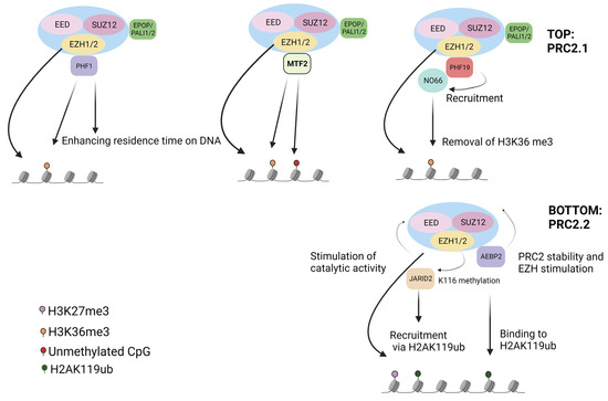 By itself, the PRC2 core complex lacks the capability to be recruited to target genes and has a significantly reduced capacity for binding chromatin. Several accessory subunits have now been identified to regulate PRC2 function. Recent comprehensive proteomic analyses have demonstrated that they form two main PRC2 subtypes, namely, PRC2.1 and PRC2.2, which are characterised by the association with specific accessory proteins and are differentially regulated, demonstrate different interactions and are recruited to DNA by independent mechanisms [38]. Although the general repressive role of PRC2 is preserved throughout evolution, its functionality has diversified remarkably, and PRC2.1 appears to be more heterogeneous than PRC2.2 [39].