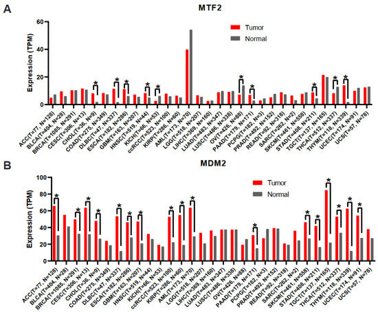 We performed MTF2 and MDM2 gene expression analysis across 33 tumours from The Cancer Genome Atlas (TCGA) (https://www.cancer.gov/ccg/research/genome-sequencing/tcga: accessed on 22 February 2023) and the GTEx dataset and paired normal tissues using the GEPIA2 web server (http://gepia2.cancer-pku.cn/: accessed on 10 February 2023). Differentially expressed genes were identified with the cut-off of Log2FoldChange of 0.58 and q-value < 0.05. The bar plot represents the median expression of the shown tumour type or normal tissue.