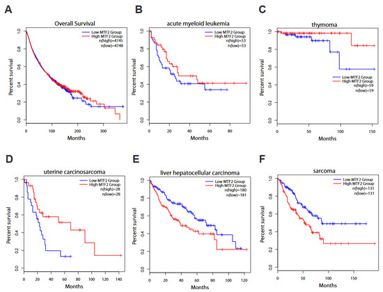 Kaplan–Meier survival rate based on MTF2 expression level. (A) Overall survival of patients with low MTF2 level (n = 4748) tends to be dire compared to their counterparts with high MTF2 (Logrank p = 0.71, n = 4745). (B) Elevated MTF2 expression in patients with acute myeloid leukaemia (AML) is concomitant with promising survival, although it does not reach a significant cut-off value (Logrank p = 0.26, n = 53). (C) Thymoma (THYM) patients with elevated MTF2 have a substantially favourable survival rate (Logrank p = 0.044, n = 59). (D) Uterine carcinosarcoma (UCS) patients survive longer when MTF2 is higher (Logrank p = 0.018, n = 28). (E) Liver hepatocellular carcinoma (LIHC) with elevated MTF2 results in dire survival rate (Logrank p = 0.0026, n (high) = 180, n (low) = 181). (F) Sarcoma (SARC)-inflicted patients with higher MTF2 levels demonstrate dismal prognosis (Logrank p = 0.002, n = 131). TCGA data from GEPIA2 web server were used for survival analyses.