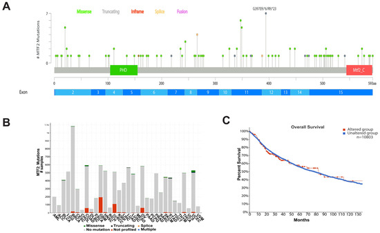 We next analysed the mutational status of MTF2 to determine its potential as a driver mutation of various cancer types using cBioportal data. In cBioPortal, TP53 stands out as one of the most frequently mutated tumour suppressors, with a mutation rate of 36%. Conversely, PIK3CA ranks as one of the prominently mutated oncogenes, with a mutation rate of 17%. Consistent with the rarity of MTF2 mutations in AML, the incidence of MTF2 mutations is very low across cancer types, with a recorded mutation rate of 1.5% observed among 10,953 patients encompassing 32 different cancer types (Figure 5A,B). The vast majority of mutations that have been detected are missense mutations distributed throughout the gene body (Figure 5A,B). Among all 32 analysed cancer types, uterine corpus endometrial carcinoma and colon adenocarcinoma had the highest mutation rates (missense mutation). Consistent with the low mutation frequency, the cBioportal data revealed no known driver mutations in the MTF2 gene. Furthermore, MTF2 mutation status did not significantly affect the survival rate of patients (Figure 5C).