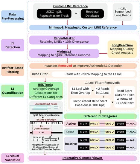 Overview of L1 analysis methods. Data Preprocessing: Reads less than 1 kb in length were removed. A custom LINE reference library was constructed by merging the UCSC hg38 RepeatMasker track with the LINE/L1 consensus sequences from the Repbase RepeatMasker library. The LINE custom library was used as a reference for mapping with Minimap2 to obtain input reads (>1 kb) containing L1 elements. L1 Detection: Reads with L1 elements with less than 10% divergence from the RepeatMasker L1 consensus were retained for Minimap2 splice-aware mapping to the hg38 reference genome. LongReadSum was utilized to report mapping statistics for quality check analysis. Artifact-Based Filtering: First, we removed reads where less than 90% of the read itself mapped to the L1 region of interest. Then, L1 regions with exon overlap, fewer than two mapped reads, inconsistent read start position among the reads within the L1 region (threshold 100 bps), and overall starting positions too far from the L1 region start position (threshold 1.5 kb) were removed from analysis to filter out likely false positives. L1 Quantification: BEDTools genome coverage and BEDTools map were used to calculate the average coverage over the three groups of L1 elements, including active, inactive, and those intact only in ORF2. The resulting values were first normalized by the total number of reads and then scaled by a million. Subsequently, a weighted average was computed, considering the length of the L1 element, across all active, intact only in ORF2, and inactive L1 loci, respectively, resulting in the final value. L1 Visual Validation: L1 candidate loci were visually validated in the Integrative Genomic Viewer.