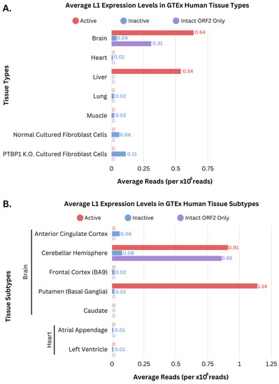 Average expression of L1 elements in 88 long-read sequenced GTEx human tissues. Average L1 expression across different human tissue samples within the active (red), inactive (blue), and intact only in ORF2 (purple) L1 categories. The general expression level of these L1 categories was determined by the mean number of reads that intersected with the L1 loci, normalized by the sample’s total read count, followed by a weighted average based on the length of the L1 element and its corresponding expression value, scaled in millions. (A) Average overall expression levels of L1 elements in the human tissue types from GTEx dataset. (B) Average overall expression levels of L1 elements in tissue subtypes from the GTEx dataset, including anterior cingulate cortex, cerebellar hemisphere, frontal cortex (BA9), putamen (basal ganglia), and caudate for brain, and atrial appendage and left ventricle for heart tissues.