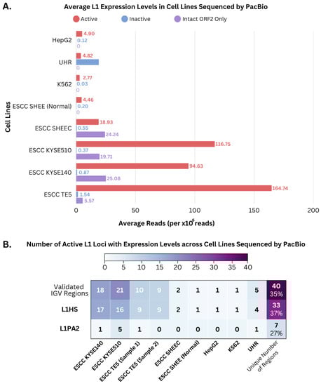 The following supporting information can be downloaded at: https://www.mdpi.com/article/10.3390/genes14101893/s1, Table S1. Sample Reference, Sample Preparation Method, Sequencing Library Protocol, and Sequencing Platform. Table S2. LongReadSum Mapping Statistics Initially and Following RepeatMasker, Mapping to hg38 Reference Genome, and Artifact-Based Filtering. Table S3. Average Number of Reads, scaled to reads per million, for the Active, Intact ORF2-Only, and Inactive L1 Elements across Tissue and Cell Line Samples. Table S4. Manually Reviewed Unique L1 Loci Genomic Locations with Corresponding Average Number of Reads, scaled to reads per million, for the Active L1 Elements across the PacBio sequenced Cell Lines. Figure S1. Manual validation of inactive and intact only in ORF2 L1 regions within ESCC KYSE140 cancer cell line using the Integrative Genomics Viewer (IGV). Figure S2. Manual validation of inactive and intact only in ORF2 L1 regions with high coverage within the UHR cancer cell line, sequenced by PacBio, using the Integrative Genomics Viewer (IGV). Figure S3. Manual validation of active and inactive L1 regions with high coverage within human brain tissues from the GTEx project using the Integrative Genomics Viewer (IGV).