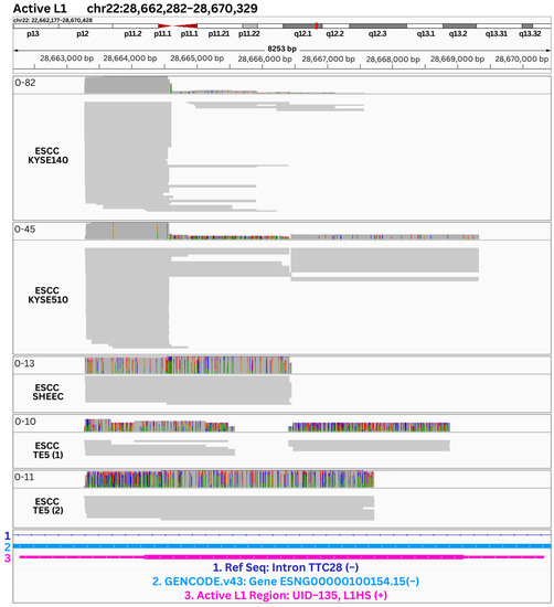 Various alignment patterns were observed, including almost full coverage, reads concentrated at the 5′ or 3′ ends, and reads distributed throughout the middle of the region. Figure 5 displays an active L1 region, chr22:28,662,282-28,670,329 (hg38), which showed expression among the four cancerous ESCC cell line samples. By inspecting the alignment patterns across the different ESCC samples, we found that the samples had regions of coverage towards the 5′ end of the L1 (111 bps downstream of the L1 region start position) and KYSE510 showed almost complete coverage of the L1 locus. Among the ESCC samples, SHEEC and TE5 showed higher mismatch patterns than KYSE140 and KYSE510. This difference is likely attributed to the characteristics of PacBio IsoSeq data. Notably, the first two samples displayed fewer mismatches due to the shorter fragments in their initial 1 kb regions. Shorter reads possess higher accuracy from the IsoSeq sequencing, benefiting from the consensus-based error correction during the IsoSeq analysis. Alternatively, the mismatch patterns in the bottom three samples may suggest the transcripts mapped to this locus originated from polymorphic L1 elements that are not represented in the reference genome. Furthermore, Supplementary Figure S1 shows the alignment patterns of reads within the ESCC KYSE140 cancer cell line at an inactive L1 region (Supplementary Figure S1A, chr6:57,284,305-57,294,481, hg38) and an intact only in ORF2 L1 region (Supplementary Figure S1B, chr10:85,354,505-85,362,552, hg38). Analyzing these alignment patterns was crucial in confirming the presence, structure, and precise location of the L1 transcripts. The evidence of L1 expression from multiple active L1 loci in the ESCC samples corroborates with previous studies that highlighted the possibility of L1 elements being involved in esophageal squamous cell carcinoma through the examination of aberrant methylation patterns [51,52]. These results support the functional relevance of L1 components in ESCC and call for future research into how L1 transcription and somatic retrotransposition can influence cancer progression.