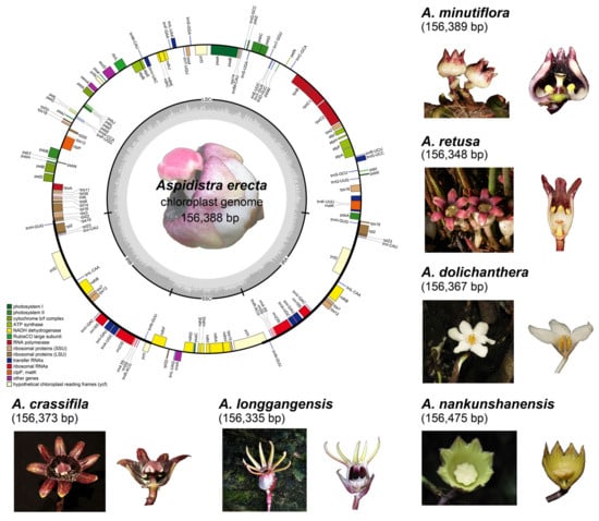 Structural map and images of seven Aspidistra species. All seven plastid genomes possess the characteristic quartile structure, comprising a pair of IR regions, an LSC region, and an SSC region. The genes inside the circle are transcribed in a clockwise direction, while the genes outside the circle are transcribed in a counterclockwise direction. Genes are color-coded to represent distinct functions, with the dark gray of the inner circle indicating the GC content in the genome and the light gray indicating the AC content. The template map is based on the structure of A. erecta.