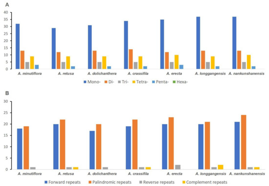 Sequence repeats in chloroplast genomes of the seven Aspidistra species. (A) Types and numbers of SSRs in the seven plastid genomes. (B) Comparison of interspersed repeats in the seven plastid genomes.