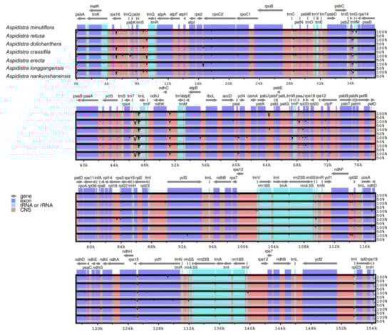 Comparative analysis with mVISTA of the plastomes of seven Aspidistra species. The chloroplast genome of A. minutiflora was used as a reference. The annotated genes and their direction are indicated by gray arrows. The different regions on the genome are marked with different colors. The vertical scale represents the similarity among sequences.
