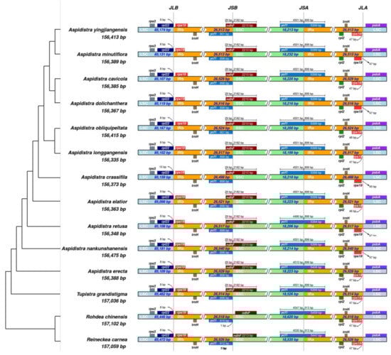 Comparison of the borders of the LSC, SSC, and IR regions of 11 Aspidistra species and three outgroups. The tree on the left is simplified from our phylogenetic results (see Section 2.6, Phylogenetic relationships in the Results). The genes near the boundary are shown above and below the mainlines. JLB, JSB, JSA and JLA represent the border loci of LSC/IRb, IRb/SSC, SSC/IRa and IRa/LSC, respectively.
