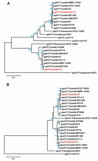 In Figure 3B, a similar division into two different clades can be observed, showing that spuC1 genes maintain a coherent evolutive distribution and that spuC2 also maintains conservation between them. Thus, this suggests, due to the proximity of the two clades, that both genes arose from duplication and are maintained in the strains, at least in P. putida. However, ygjG from E. coli shows a clear evolutive difference from the other putrescine transaminase analyzed.