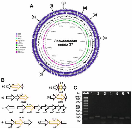 Relative position in the P. putida G7 genome of the genes used in the qPCR analysis. From a–g are the positions of the B-pannel genes in the P. putida G7 genome (A), and relative position of the optimal primers used for these studies (B). In (C), amplicons obtained through the qPCR were identified based on their mobility and size determined in an agarose gel (2.5%), and later, their sequence was determined through Sanger sequencing (Supplementary Figure S1). In the gel, MwM, molecular weight markers; 1. recA amplicon; 2. rpoD amplicon; 3. rpoN amplicon; 4. spuC1 amplicon; 5. spuC2 amplicon; 6. gabT1 amplicon; 7. gabT2 amplicon.