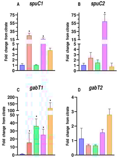 Fold change of expression of spuC1 (A), spuC2 (B), gabT1 (C), and gabT2 (D) genes analyzed when P. putida U was cultured in citrate (blue), putrescine (red), GABA (green), cadaverine (purple), or DAVA (orange) at 10 mM as sole carbon and energy source. Values are means ± standard deviation (SD) (n = 4). Statistical significance was determined with ANOVA for citrate; * is p < 0.05.