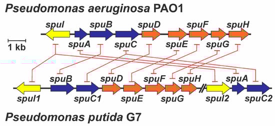 Schematic representation of the spu cluster of genes and in P. aeruginosa PAO1 and P. putida G7 showing the genetic rearrangements between both strains. Orange color indicates genes putatively involved in the uptake of polyamines, whereas blue color indicates genes whose products participate in polyamine catabolic processes. Yellow color (spuI genes) indicates genes that putatively encoded glutamine synthetase-like proteins that, although in the literature about catabolism of polyamines in Pseudomonas have been suggested as participants in the polyamine catabolic process, Krysenko et al. demonstrated, in S. coelicolor, their participation in γ-glutamylation of polyamines and other monoamines []. Red lines indicate the genetic rearrangements affecting genes in both bacteria, evidencing the presence of some paralog genes in P. putida G7. NOTE: During the processing of this article, authors have confirmed through PCR amplification using degenerate primers designed based on the genome of P. putida G7, the maintaining of the synteny to the corresponding genes between G7 strain genes and those present in the genome of P. putida U (data not shown).