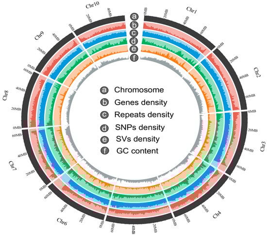 Circos plot of the ‘Jeju17’ genome showing the chromosome (a), genes density (b), repeat density (c), SNPs density (d), structural variant density (e), and GC content (f). The chromosomes are arranged in order of length.