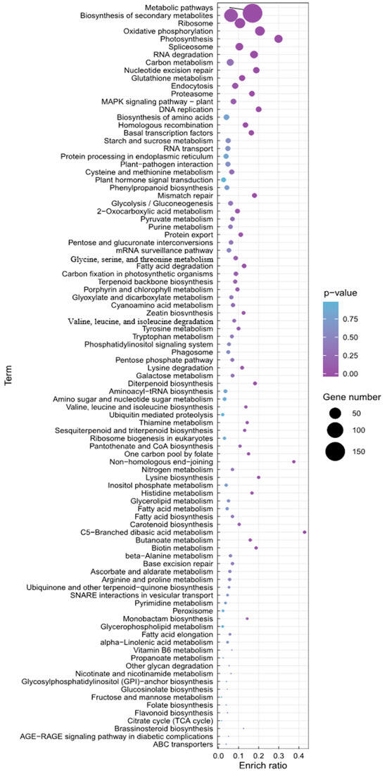 KEGG enrichment bubble plot depicting the functional attributes of the ‘Jeju17’ species-specific gene sets. These differentially expressed genes were grouped into gene pathways using pathway enrichment analysis with the KEGG database. Low q-values are in purple, and high q-values are in blue. The size of the circle is proportional to the number of enriched genes.
