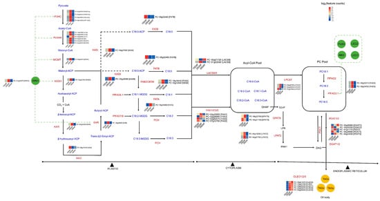 A simplified overview of the fatty acid and lipid triacylglycerol biosynthesis pathways in Perilla. The heat map shows transcript changes in triacylglycerol biosynthesis. Upregulated genes are in red, and downregulated genes are in green.