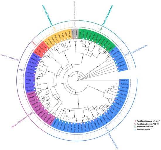 - Duan, W.; Shi-Mei, Y.; Zhi-Wei, S.; Jing, X.; De-Gang, Z.; Hong-Bin, W.; Qi, S. Genome-Wide Analysis of the Fatty Acid Desaturase Gene Family Reveals the Key Role of PfFAD3 in α-Linolenic Acid Biosynthesis in Perilla Seeds. Front. Genet. 2021, 12, 735862. [Google Scholar] [CrossRef] [PubMed]