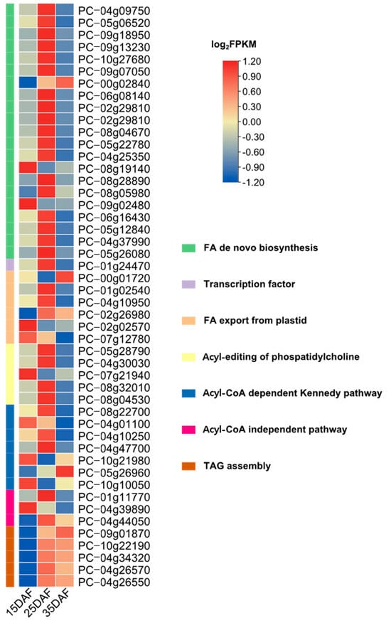 Seed expression of fatty acid and lipid triacylglycerol-related enzymes. A heatmap of the expression dynamics of gene members in seven clusters (FA de novo biosynyhesis, transcription factor, FA export from plastid, acyl editing of phospatidylcholine, acyl-CoA dependent Kennedy pathway, acyl-CoA independent pathway, and TAG assembly) representing specifically expressed genes is shown.