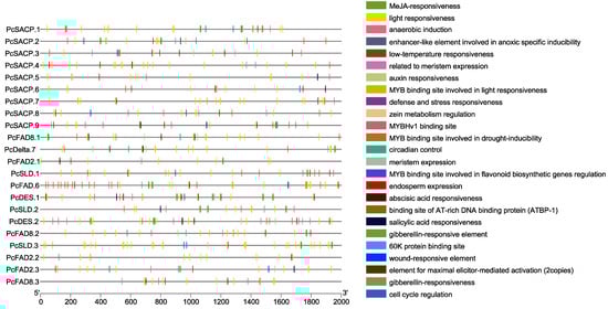 Cis-acting element analysis results from a 2 Kbp promoter region of fatty acid desaturases identified in the ‘Jeju17’ genome. The distribution of cis-elements in the 2000 bp promoter region related to abiotic stress responses is depicted. Each cis-element is represented by a specific color.