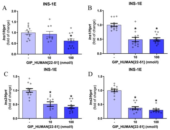 Initially, we evaluated the effects of GIP_HUMAN [22–51] on insulin mRNA expression in INS-1E cells. Of note, rodents express two nonallelic genes of insulin (Ins1 and Ins2). Ins2 is an ortholog to the human insulin gene []. As shown in Figure 1, GIP_HUMAN [22–51] suppressed insulin 1 (Ins1) mRNA expression in INS-1E cells after 3 h (Figure 1A) and 24 h (Figure 1B). Moreover, GIP_HUMAN [22–51] downregulated Ins2 mRNA expression assessed after 3 h or 24 h (Figure 1C,D). Additionally, the suppression of Ins1 and Ins2 mRNA expression was found in freshly isolated rat pancreatic islets exposed to GIP_HUMAN [22–51] at 100 nmol/L for 24 h (Figure 1E,F). Furthermore, to study whether the changes in expression of mRNA levels are accompanied by changes in protein production, we assessed the effects of GIP_HUMAN [22–51] on intracellular insulin content in INS-1E cells. As shown in Figure 1G, GIP_HUMAN [22–51] downregulated intracellular insulin content at the concentration of 100 nmol/L after 24 h.