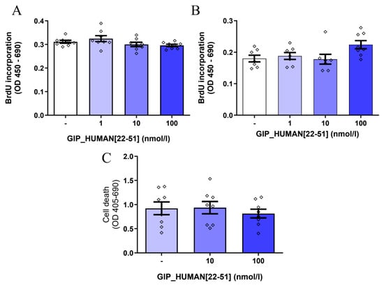 First, INS-1E cells were cultured in 96-well plates (2 × 104 cells/well). After 24 h, the incubation medium was exchanged for a serum-free medium, and cells were cultured for an additional 24 h at 37 °C. Afterwards, this medium was replaced by the medium supplemented with GIP_HUMAN [22–51] at 1, 10, or 100 nmol/L. Cells were then cultured for 24 and 48 h. The BrdU incorporation was tested using the Cell Proliferation ELISA BrdU (colorimetric) Kit (Roche Diagnostics, Manheim, Germany). In brief, after the incubation with the GIP_HUMAN [22–51] peptide, a BrdU solution with a final concentration of 10 µmol/L was added to each well, and cells were cultured in a cell culture incubator for an additional 2 h. Next, the cell culture medium was removed, 200 µL of FixDenat solution was added, and cells were incubated for 30 min at RT. Afterwards, the FixDenat solution was removed and 100 µL of Anti-BrdU-POD working solution was added. After the incubation (70 min at RT), plates were washed three times using the washing buffer. Next, a substrate solution (100 µL) was added, and plates were incubated for approximately 10 min. The reaction was stopped by the addition of 25 µL HCl. The absorbances of samples were measured at 450 nm (reference wavelength was 690 nm) using a Synergy 2 Multi-Mode Microplate Reader (BioTek, Winooski, VT, USA).