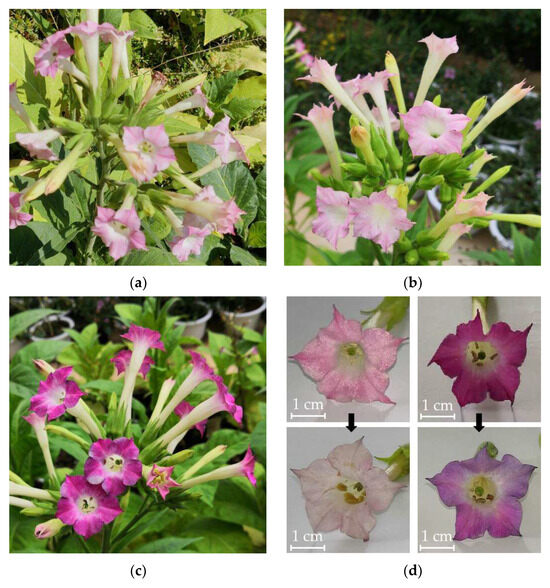 Flower color phenotypes of PgF3′5′H transgenic T0 generation tobacco. (a) Empty vector transgenic plant; (b) non-transformed wild-type tobacco K326 plant; (c) PgF3′5′H transgene line W-58 plant; (d) different flower stages of empty vector transgenic control plant (left) and PgF3’5’H transgene line W-58 plant (right). Upper: full-bloom period, lower: flower senescence period.