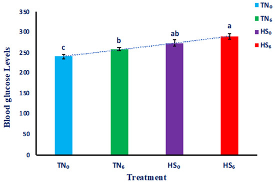 The blood glucose levels for TN0, TN6, HS0, and HS6 are summarized in Figure 1. The blood glucose levels for the TN groups (TN0 and TN6) were lower (p < 0.05) than those of the HS6 group. The HS groups (HS0 and HS6) had higher (p < 0.05) blood glucose levels than the TN0 group. Also, the TN0 group had the lowest (p < 0.05) levels of blood glucose compared with TN6, HS0, and HS6. Additionally, the blood glucose level for TN6 was higher (p < 0.05) than for TN0. However, there were no differences (p > 0.05) in blood glucose levels between HS0 and HS6, or between HS0 and TN6.