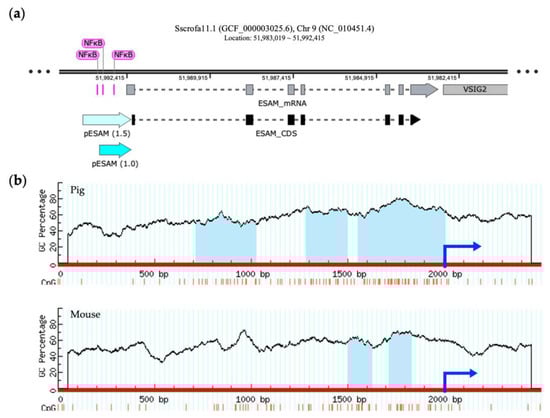 Identification of a potential promoter region in porcine ESAM. (a) Schematic representation of the structure of porcine ESAM using SnapGene software 7.0 (Dotmatics, Bishop’s Stortford, UK). The ESAM1.0 and ESAM1.5 promoter regions are denoted by light blue arrows. The segments colored pink represent the predicted NFκB-binding site. (b) Prediction of CpG islands in the 5′-flanking regions of porcine and murine ESAM. The red line represents the sequence of ESAM, the blue arrow represents the initiation site of the coding sequence (CDS) region, and the light blue area represents the predicted CpG island. NFκB, nuclear factor kappa B; ESAM, endothelial cell-specific adhesion molecule; PEAR1, platelet endothelium activation receptor 1; ICAM2, intercellular adhesion molecule 2.
