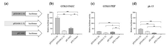 PAECs and porcine ear fibroblasts (PEFs) were isolated from a 1-month-old GGTA knockout (GTKO) pig [,]. The PAECs were then grown in endothelial cell growth medium-2 (Lonza, Basel, Switzerland). The PEFs were cultured in Dulbecco’s modified Eagle’s medium (DMEM, Gibco, Grand Island, NY, USA) supplemented with 10% fetal bovine serum (Gibco), antibiotic-antimycotic (Gibco), non-essential amino acids (Gibco), low serum growth supplement (Gibco), and 2-mercaptoethanol (Gibco). The pk-15 cells were cultured as previously described []. Briefly, the cells were maintained in DMEM (Gibco), supplemented with 10% fetal bovine serum (Gibco) and antibiotic-antimycotic (Gibco). The cells used in this study were incubated at 37 °C in a humidified atmosphere containing 5% CO2. Transfections for PAECs and PEFs were performed using the Amaxa basic nucleofector (Lonza) according to the manufacturer’s instructions. The pk-15 cells were transfected using a Lipofectamine 3000 Kit (Invitrogen, CA, USA), according to the manufacturer’s protocol. pGL3 vectors were used for the luciferase assays.