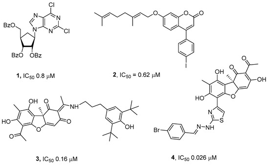 The list of Tdp1 inhibitors is quite extensive and includes both natural substances and their derivatives (detailed in the review [22]) and synthetic compounds [27] (Figure 1). In the series of our works, we found effective Tdp1 inhibitors including those that are derivatives of usnic acid [22]. IC50 values for compounds 1–4 (Figure 1) and others in our works were measured on purified recombinant human Tdp1 by real-time fluorescence measurement. We have shown that the application of Tdp1 inhibitors (compounds 1–4, Figure 1) in combination with topotecan increases its antitumor and antimetastatic efficacy against tumors in mice in vivo [32,33,34,35]. The usnic acid derivatives are the most effective Tdp1 inhibitors known to date (similar to compound 4 in Figure 1), acting in the nanomolar concentration range and capable of potentiating the antitumor and antimetastatic effects of topotecan in vitro and in vivo [22].