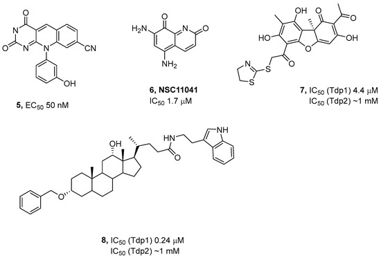 Of note is the recently discovered ability of Tdp1 and Tdp2 to take over each other’s functions, albeit with lower efficiency [29,30,31]. This makes either the combined use of selective inhibitors of these two enzymes highly promising or the creation of agents capable of simultaneously inhibiting Tdp1 and Tdp2.