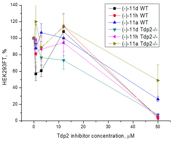Since Tdp inhibitors are intended to be used in therapeutic cocktails, non-toxic concentrations of the compounds are required so as not to exacerbate the already serious side effects of therapy. We studied the intrinsic cytotoxicity of the compounds, (−)-11a,d,h, that inhibited Tdp2 on HEK293FT wild-type cells and Tdp2 knockout (Tdp2−/−) cells (Figure 3). Tdp2 knockout HEK293FT cells were obtained using the CRISPR/Cas9 method. At 10 μM concentration, the cell survival was not less than 80% for both types of cells. This concentration was chosen for further studies of the ability of the compounds to sensitize the effect of the Top2 inhibitor etoposide.