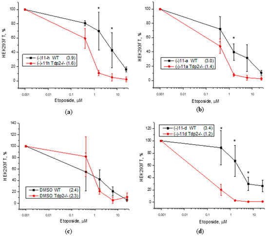 Dose-dependent action of etoposide in combination with vehicle (DMSO 1%) (a), 10 μM of (−)-11d (b), (−)-11h (c), and (−)-11a (d) on HEK293FT WT and Tdp2−/− cells viability. In the legends of the figures, CC50 values in μM are given in parentheses. An asterisk marks points that differ significantly according to the Mann–Whitney test, p = 0.05.