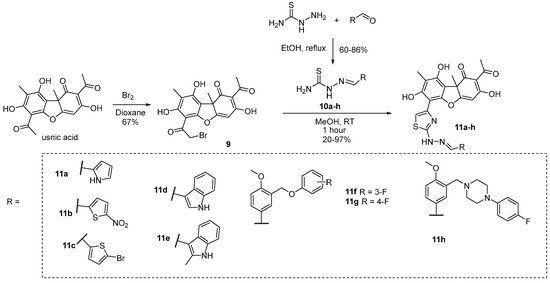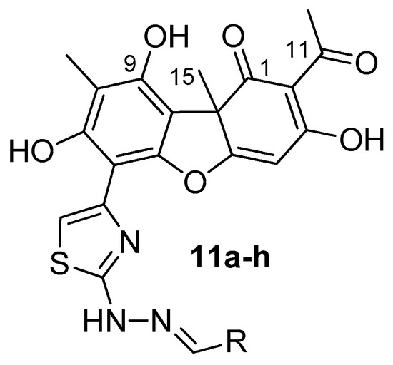 We obtained R-(+)-usnic acid and S-(−)-usnic acid by extraction from a mixture of the lichen genus Cladonia stellaris and Usnea and used the extract as a starting material [50]. The synthesis of the bromo-substituted derivatives (+)-9 and (−)-9 was performed by reaction of the corresponding enantiomer of usnic acid with bromine in dioxane [51]. The hydrazonothiazoles (+)-11a–h and (−)-11a–h were synthesized by the heating of the bromo-substituted derivatives 9 with thiosemicarbazones 10a–h in methanol [44]. We filtered off the precipitate, dissolved it in methylene chloride, washed the precipitate with sodium bicarbonate solution, and evaporated the organic phase (Scheme 1). Usnic acid derivatives (+)-11a–h and (−)-11a–h were obtained with yields from 20% to 97%.