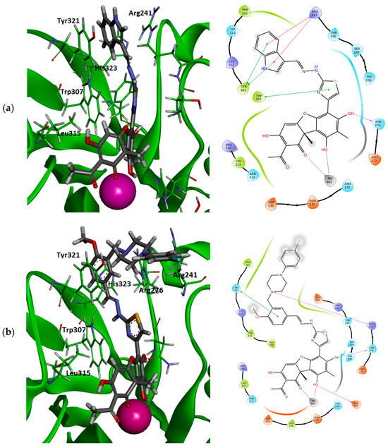 For the elucidation of the influence of stereoisomeric usnic acid fragments on the Tdp2 inhibitory activity, the derivatives (+)-11a–h and (−)-11a–h were docked into the binding site. Due to the significant size of the molecules as well as their conformational flexibility, a number of the significant differently docking poses were obtained. Nevertheless, some poses with the specific binding pattern were found only for the (−)-enantiomers. Thus, the usnic acid fragment seemed to be a bidentate ligand of the magnesium ion located in the active site and play a key role in the Tdp2 activity [52]. The Mg2+ binding could be realized by C1=O and either C9-O or C11=O oxygen atoms of the usnic acid fragment (see the atomic numeration in Figure 5). At the same time, the usnic acid core interacts with the lipophilic flat surface formed by Leu-315 and Trp-307. The angular C-15 methyl group could be oriented to the solvent or to the small lipophilic cavity formed by Leu-134, Tyr-188, Met-214, and His-236. That orientation seems to be more preferable for both (−)- and (+)-stereoisomers. It is interesting that it is only for the (−)-enantiomers that this orientation could lead to the location of the extended substituent containing thiazole fragment in the corresponding elongated cavity (formed by Trp-307, Tyr-321, Arg-241, and His-323). A number of stacking interactions could be formed, i.e., between Trp-307, Tyr-321, and thiazole or usnic acid fragments or with aromatic systems of the substituents R in the hydrazone moiety (Figure 6). Binding of the (−)-usnic acid derivatives to the enzyme could lead to the blocking of the catalytic site containing the key amino acids such as Arg-272 and Asn-274 and a magnesium cation. The thiazole-containing tail could bind several of the amino acid residues responsible for binding to the damaged 5′-end of DNA, including His-236, Ser-239, Arg-241, Arg-276, Leu-134, Trp-307, and Leu-315, thus eliminating the ability of the protein to bind to the substrate in the catalytic site [48,53]. In summary, only the (−)-enantiomers seem to be able to bind the catalytic site and the pocket simultaneously, hindering the binding and orientation of the damaged DNA that could result in their Tdp2 inhibitory activity in contrast to (+)-isomers.