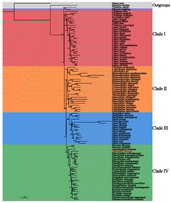 The phylogenetic analysis based on ML and BI was performed using the nucleotide sequences of 13 PCGs of L. laticeps and the other 96 species of the Labeoninae subfamily (Figure 5 and Figure S1). The results showed that the topological structures of the ML tree and the BI tree were similar (Figure 5 and Figure S1), and the 96 species were grouped into four clades except for Decorus tungting. The phylogenetic positions of clade II and clade III were reversed in the BI and ML trees, indicating that the evolutionary relationship of these two clades in the Labeoninae was unclear. Overall, the phylogeny of Labeoninae reconstructed in our study was very similar to previous studies [11,35]. However, the monophyly of Labeoninae has not been confirmed, and the intergeneric relationship of the labeoninae was controversial. D. tungting was previously known as Bangana tungting, and Bangana was composed of two clades in Labeoninae in previous molecular phylogenetic studies [9]. In recent years, the genus Bangana has been revised and renamed into a new genus, Decorus [36]. However, the phylogenetic position of D. tungting in this study was different from that in the previous study [36]. Therefore, we suggest that the taxonomy of D. tungting requires further revision.