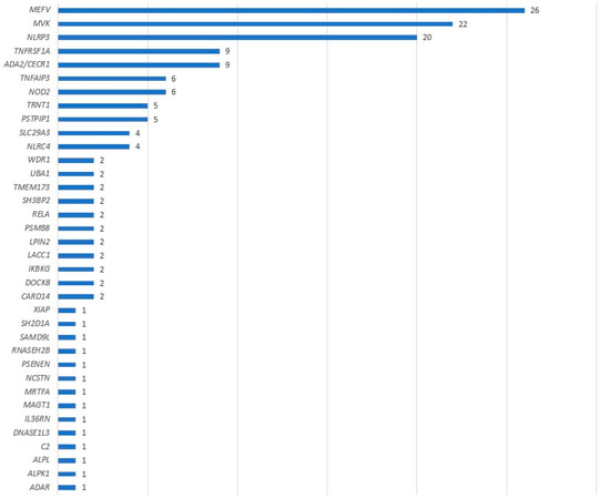 Autoinflammatory diseases are a subset of immune-related disorders specifically arising from innate immune system hyperactivation. The most typical symptoms associated with these diseases are recurrent fevers, arthralgia, skin rash, or biological inflammation marker concentration elevation, such as C-Reactive Protein (CRP) or Serum Amyloid A protein (SAA). Knowing these diseases are influenced by genetic and environmental factors, their pathophysiology is complex [1]. One of the first monogenic autoinflammatory disease to be studied was Familial Mediterranean Fever (FMF, OMIM #249100) for which Mendelian inheritability was described for the first time in the Armenian population in 1989 [2]. The molecular basis of this disorder was described in 1997 [3,4] as a mainly autosomal recessive condition.