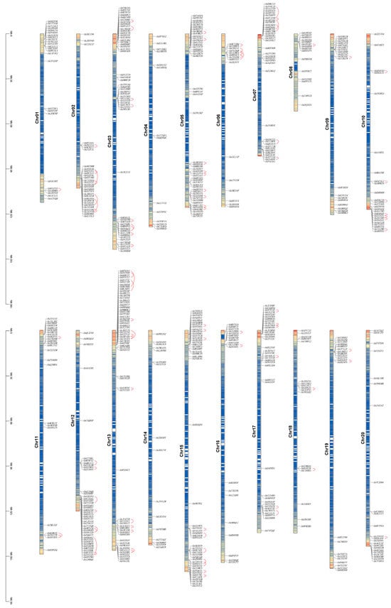 Distribution map of 589 AhCYPs on 20 peanut chromosomes. Chromosome lengths (in Mb) are indicated on the left scale bar. Chromosome numbers are displayed on the left side of each chromosome, while gene IDs are shown on the right. Tandemly duplicated genes are highlighted by red lines.