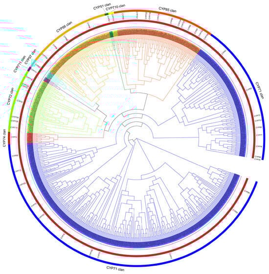 Cytochrome P450s (CYPs) represent a superfamily of enzymes that are ubiquitously found across eukaryotes and prokaryotes, spanning animals, plants, fungi, protists, archaea, bacteria, and even certain viruses. This widespread distribution hints at their ancient evolutionary origins [1,2]. Originally, these enzymes earned the name “cytochrome P450” due to their propensity to bind to CO in a reduced state, displaying an absorption peak at 450 nm, and regarded as pigments with heme-containing protein characteristics [3,4]. Subsequent research unveiled their true nature as enzymes facilitating oxidative modifications of diverse substrates, employing oxygen and NAD(P)H as essential cofactors [5]. Today, they are also recognized as monooxygenases, capable of introducing oxygen atoms into hydrophobic molecules, rendering them more active or hydrophilic [6]. In plants, CYPs constitute one of the most extensive enzyme protein superfamilies. Structurally, all known plant CYPs are membrane-bound enzymes, predominantly anchored in the endoplasmic reticulum membrane via a hydrophobic signal sequence at their N-terminus [7]. Presently, following the established CYP450 nomenclature, the plant genome encompasses a total of 10 clans, 74 families, comprising 127 distinct subfamilies [1].