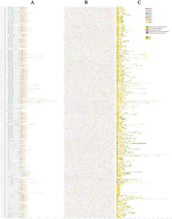 The gene structure of each AhCYP was depicted based on the genome sequence and its annotation file using the “Gene Structure View” tool within Tbtools v1.127 [37]. We predicted the conserved motifs of the AhCYPs using MEME v5.5.4 (https://meme-suite.org/meme/doc/meme.html, accessed on 12 May 2023), specifying a maximum of ten motifs and an optimized motif width ranging from 6 to 50 [38]. To analyze cis-acting elements within the AhCYPs, we employed PlantCARE (http://bioinformatics.psb.ugent.be/webtools/plantcare/html/, accessed on 13 May 2023) [39]. Visualization of the aforementioned data was achieved using Tbtools v1.127.