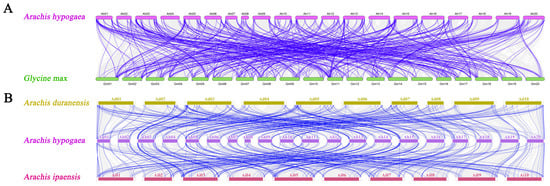 Syntenic relationships of AhCYPs across peanut and three representative plant species. (A) Comparison between G. max and A. hypogaea. (B) Comparison among, A. duranensis, A. ipaensis and A. hypogaea. Gray lines indicate collinear blocks within A. hypogaea and other plant genomes, while blue lines emphasize syntenic AhCYP gene pairs. Note: This graph was drawn using MCScanX in TBtools v1.127.