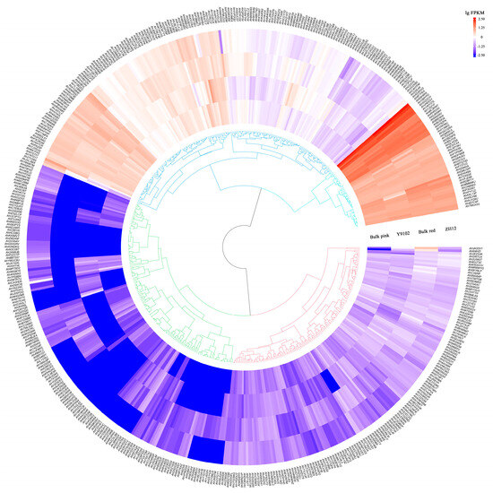 In this investigation, we examined the expression of AhCYPs using transcriptome data obtained from four materials: ZH12, Y9102, Bulk-red, and Bulk-pink. The latter two comprised mixtures of red testa and pink testa, respectively, in the F4 generation of Y9102 and ZH12 hybridization. These data are accessible via the NCBI website’s Sequence Read Archive (SRA) (https://www.ncbi.nlm.nih.gov/sra, PRJNA886491, accessed on 2 July 2023) [42]. We selected AhCYPs with non-zero FPKM (fragments per kilobase of transcript per million fragments mapped) values from the four materials for analysis. The FPKM values underwent preprocessing with log10 transformation and were used to generate heatmaps using the R program v4.1.2. Differentially expressed genes (DEGs) were statistically analyzed using Excel, employing the criteria |log2FC| ≥ 1 and p < 0.05.