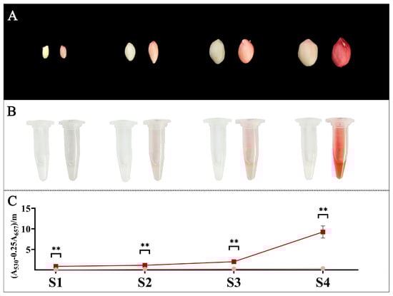 Phenotypes and anthocyanidin content of testa in four stages (S1–S4) of Y9102 and ZH12. (A) The phenotypes of Y9102 and ZH12 testa at different stages, with Y9102 on the left and ZH12 on the right in a pair of seeds. (B) The visual display of anthocyanins extracted from the testa of Y9102 and ZH12, Y9102 on the left centrifuge tube and ZH12 on the right. (C) Determination of anthocyanin content. The dark red line is ZH12, and the pink line is Y9102. Asterisks indicate significant differences in anthocyanidin accumulation between ZH12 and Y9102 in this period (** p < 0.01; t-test).