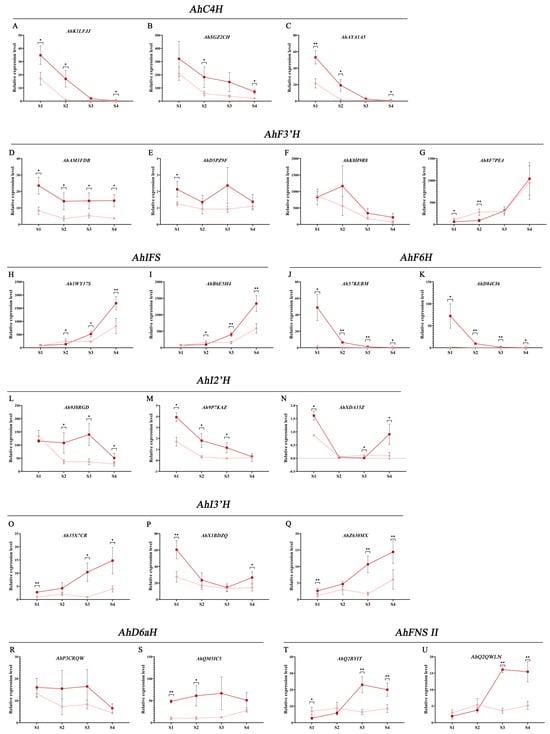 Moreover, we found that all genes have stage specificity and their expression changes adhere to distinct regulations. Isoenzyme genes frequently exhibit similar expression patterns, especially among the major genes. For instance, AhK1LFJJ, AhSGZ2CH, and AhAYA1A5, all of which are AhC4H, displayed their highest expression levels during the S1 period in both pink and red testa, followed by a rapid and consistent decline in subsequent stages. Notably, their expression levels in red materials consistently exceeded those in pink materials (Figure 9A–C). Similarly, the expression levels of AhIFS, Ah1WY37Sc and AhB6E5H4 witnessed a significant upregulation from S1 to S4 (Figure 9H,I). In contrast, certain genes exhibited differential expression patterns in pink and red testa. For instance, the two AhF6H genes displayed peak expression in the S1 stage in red material, followed by a sharp decrease, whereas they were nearly inactive from S1 to S4 in pink material (Figure 9J,K). As for the two AhFNS II genes, they initially increased in red testa, reaching their zenith at the S3 stage and subsequently experiencing a slight decline. Conversely, no significant changes were observed in pink testa (Figure 9T,U).
