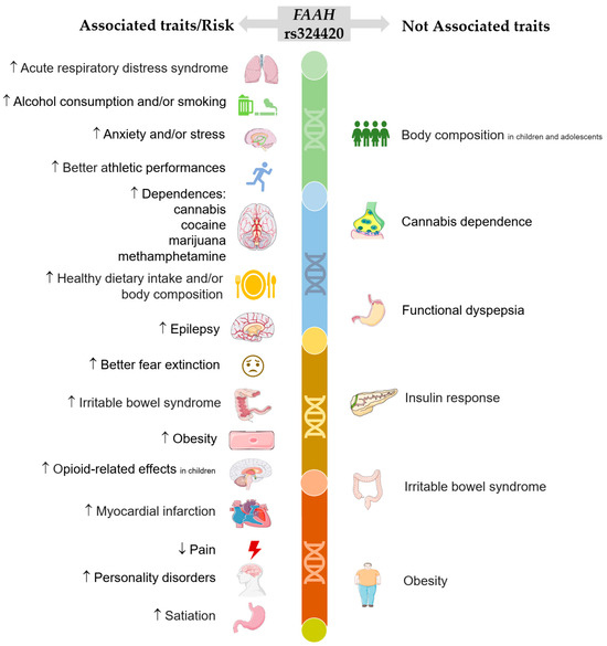 Scientific publications selected in PubMed reporting associated (n = 54) and not associated (n = 6) traits linked to psychobiological pathways of fatty acid amide hydrolase (FAAH) rs324420. Genetic variants of this polymorphism have been associated with the increased (↑) or decreased (↓) risk of experiencing various pathologies, disorders and/or behaviours, such as: (1) suffering acute respiratory distress syndrome [15]; (2) consuming alcohol and/or smoking [11,16,17,18,19,20,21]; (3) experiencing anxiety and/or stress [22,23,24,25]; (4) achieving better athletic performances [6,26,27,28]; (5) suffering substance dependences in adults, including cannabis [12,29,30,31,32,33], cocaine [34], marijuana [35,36,37,38] and methamphetamine use [39]; (6) practicing a healthier dietary intake and/or body composition [40,41,42,43]; (7) suffering neurological disorders, such as epilepsy [26]; (8) dealing better with fear extinction [44,45,46,47,48]; (9) suffering irritable bowel syndrome [13,49,50]; (10) being obese [51,52,53]; (11) experiencing opioid-related effects in children [54,55,56]; (12) suffering myocardial infarction [57]; (13) feeling less pain [58,59,60]; (14) having personality disorders [10,42]; and (15) feeling satiation more easily [61]. On the other hand, a few studies have not found associations between FAAH rs324420 variants and body composition in children and adolescents [62], cannabis dependence [29], functional dyspepsia [63], insulin response [64], irritable bowel syndrome [65] and obesity [66].