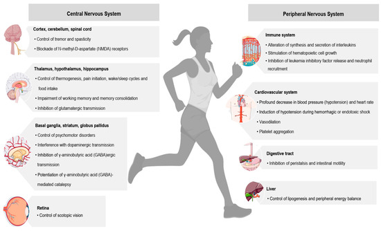 Effects of the endocannabinoid system in central nervous and peripheral systems (adapted from Wang, Dey and Maccarrone) [74]. The activation of several molecular targets by the endocannabinoid anandamide or the 2-arachidonoidglycerol results in a variety of biological actions, affecting practically all central and peripheral systems in animals, as shown.