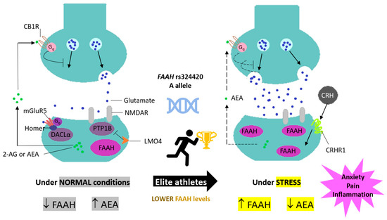 Sport medicine specialists and technical staff should be aware that athletes with genetically reduced FAAH activity and who are repeatedly submitted to stress (permanently elevated AEA) during their childhood may be vulnerable to anxiety and depression in later life due to long-term effects on stress response possibly by the CB1R downregulation throughout brain neurodevelopment [23].